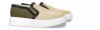 Slip-on rialzanti fatte a mano in Italia con tomaia in tessuto traspirante verde, suede beige e dettagli in pelle di vitello lucida effetto vintage dalla particolare nuance grigia con riverberi verde scuro. La suola bianca è in gomma naturale.