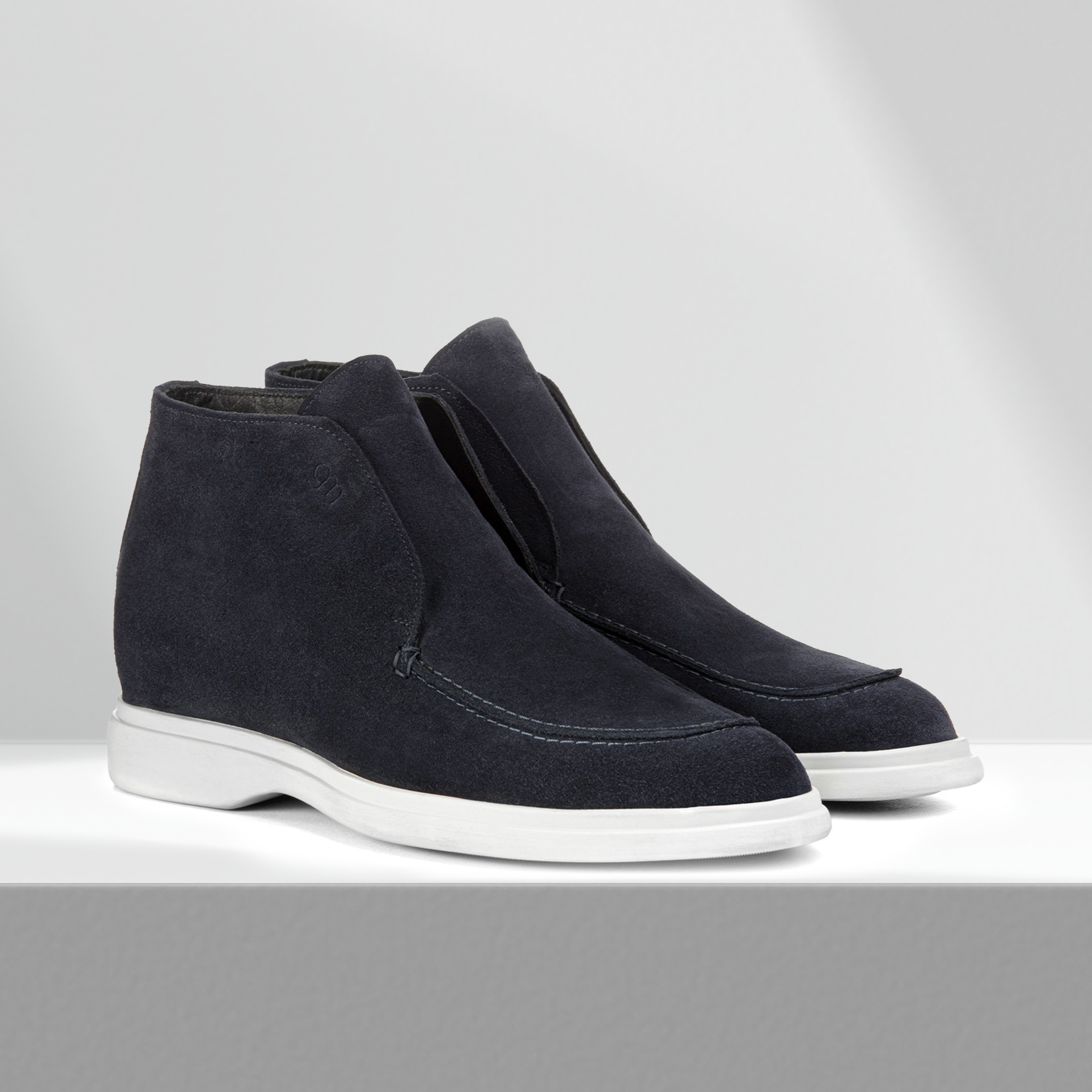 A questo punto, le scarpe devono fare la differenza. Qui entrano in gioco le polacchine Northbridge. Realizzate a mano in camoscio blu navy, con suola grigia a contrasto, queste scarpe hanno linee morbide e un carattere versatile. Gli elastici laterali e le cuciture a vista ne sottolineano il design ricercato, mentre il rialzo interno invisibile fino a 8 cm ti regala altezza e autostima con discrezione. Indossare un giubbotto viola con jeans navy e un paio di polacchine Northbridge significa puntare su uno stile coerente, regale e contemporaneo, perfettamente in linea con le tendenze attuali.