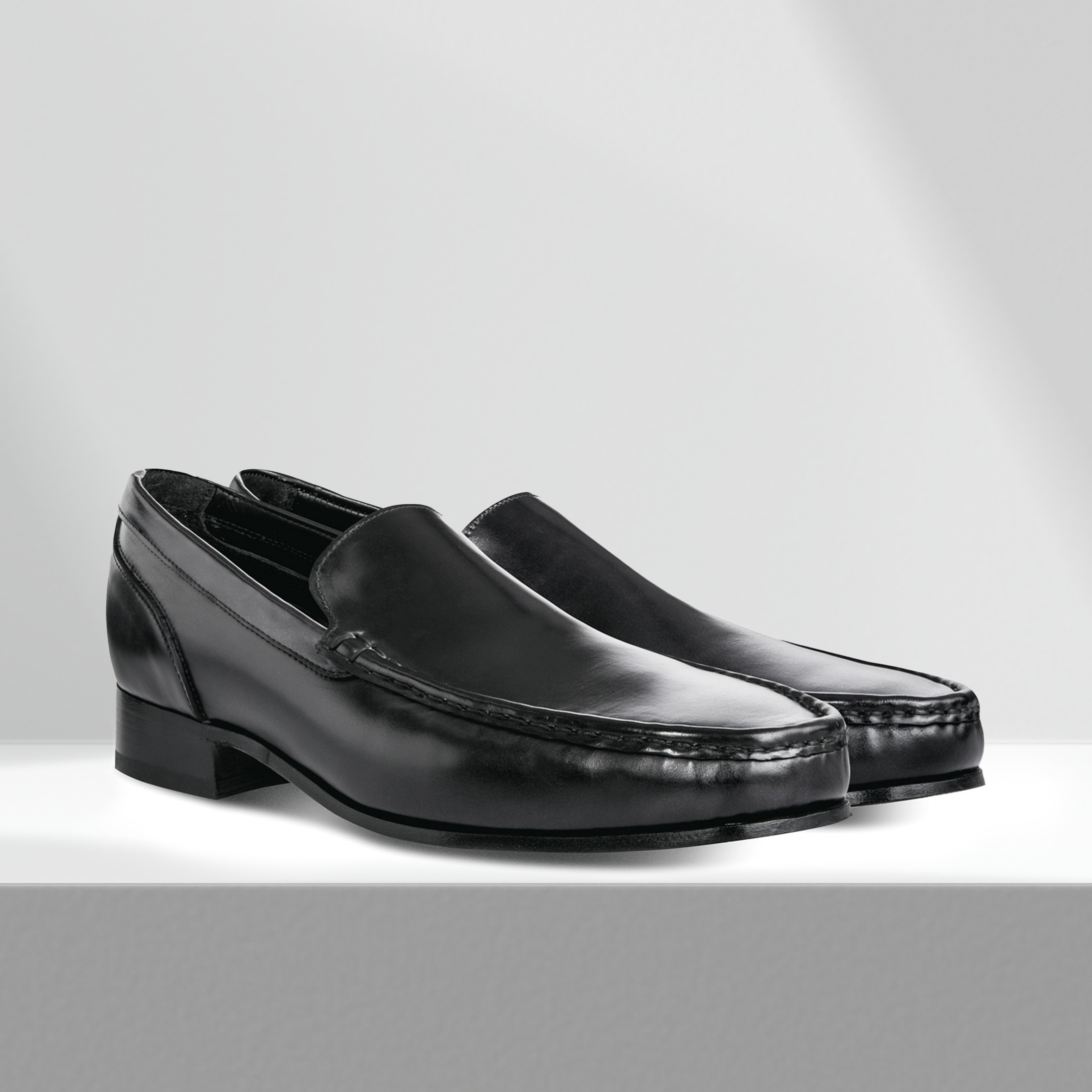 A questo punto, serve la scarpa giusta. Niente fronzoli, niente eccessi: solo eleganza e carattere. Per questo abbiamo scelto i mocassini Sohar. Un modello esclusivo in Shell Cordovan nero, con suola in cuoio cucita a mano con lavorazione Goodyear. Essenziale, raffinato, senza tempo. Ma con un plus che fa la differenza: il rialzo interno che ti regala 6 cm in più di altezza senza rinunciare al massimo comfort.