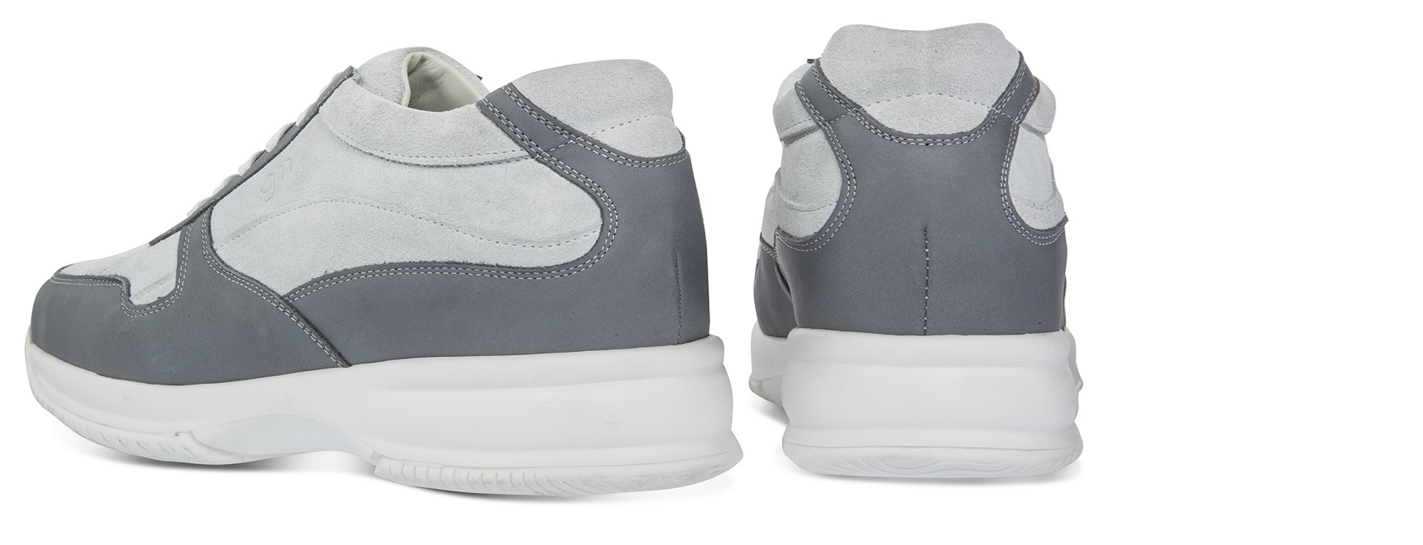Regine della primavera-estate, le nuove sneakers con rialzo della collezione GuidoMaggi si impongono per uno stile unico. Dinamiche e chic allo stesso tempo, hanno la tomaia in doppia pelle: scamosciato grigio affiancato a vitello grigio pastello.