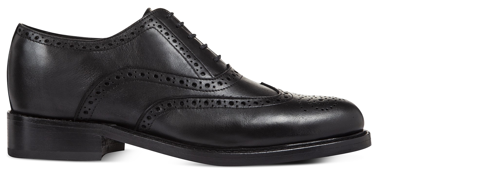 Scarpa con rialzo modello oxford realizzata in pelle di vitello nera con punzonatura full brogue fatta a mano.La suola in vero cuoio con antiscivolo in gomma è cucita a vista.