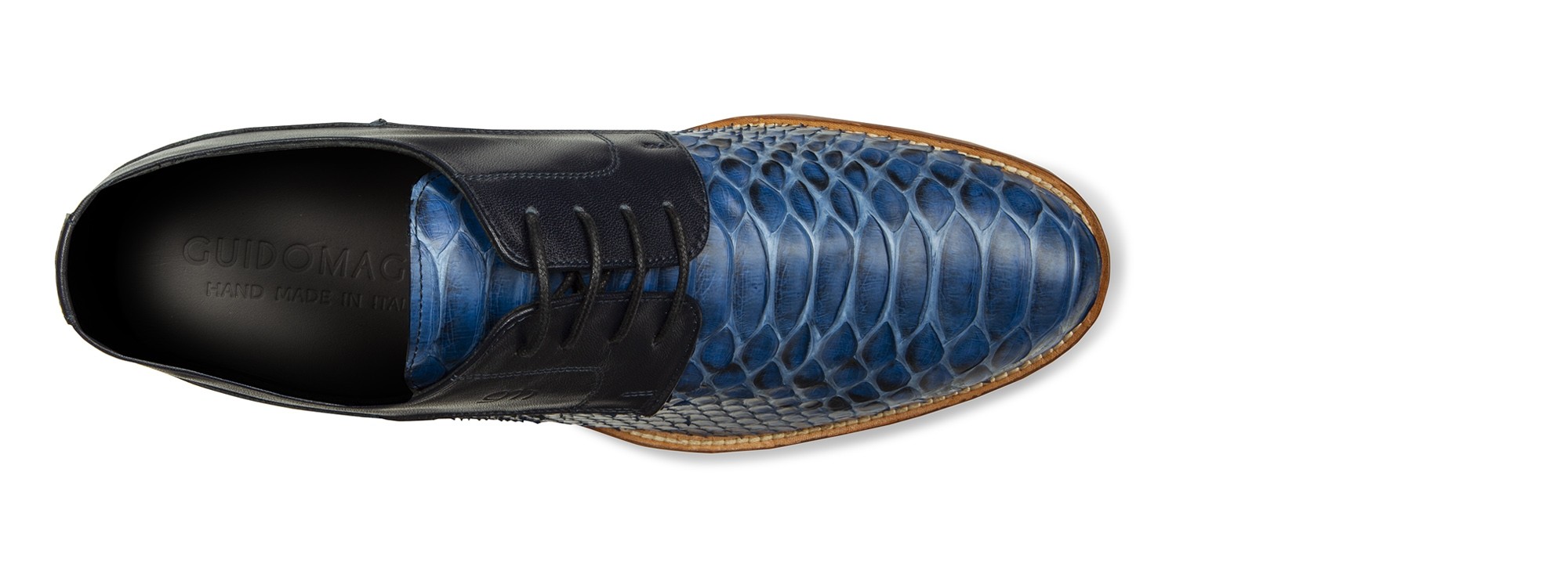 Un ever green dal design innovativo: la nuova scarpa con rialzo della collezione primavera-estate GuidoMaggi ha un animo contemporaneo plasmato dal mix di pellami che ne definiscono la tomaia. La parte anteriore è in pregiato pitone di taglio back cut, dal blu intenso con sfumature nere.