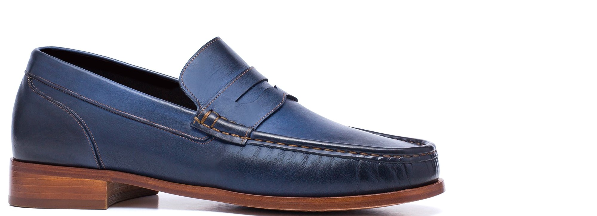 Mocassino rialzante con tomaia in morbida pelle di vitello dalla colorazione blu navy che grazie alla tamponatura a mano, genera tonalità cromatiche ora più scure come su punta e contrafforte, ora più chiare come sul collo e ai lati.