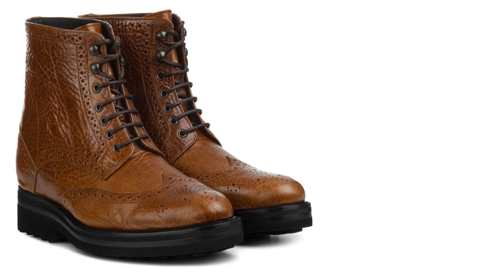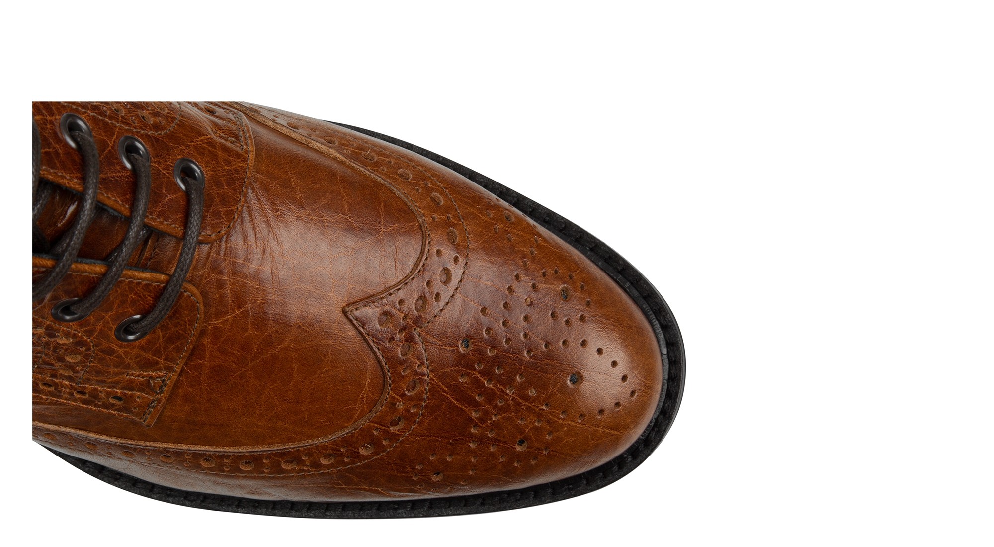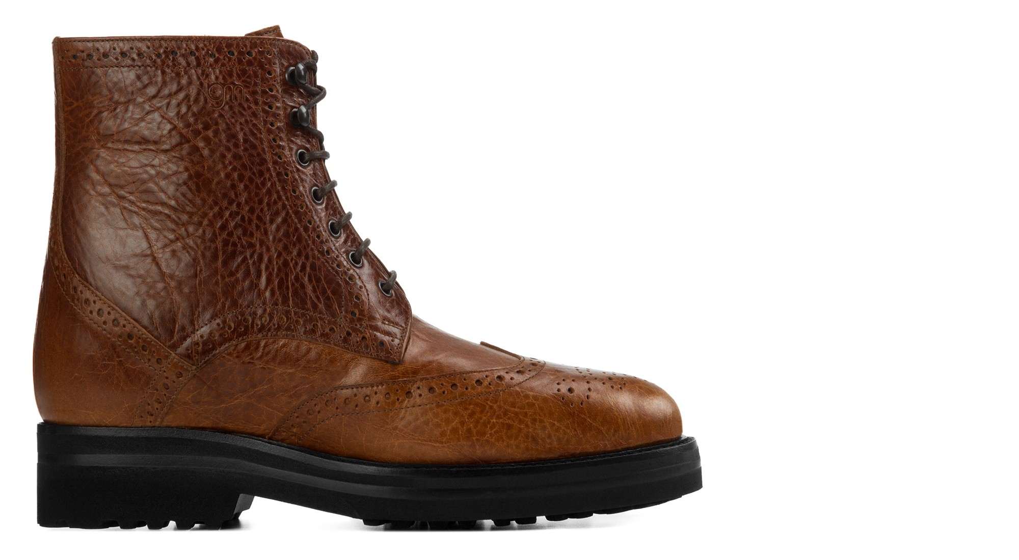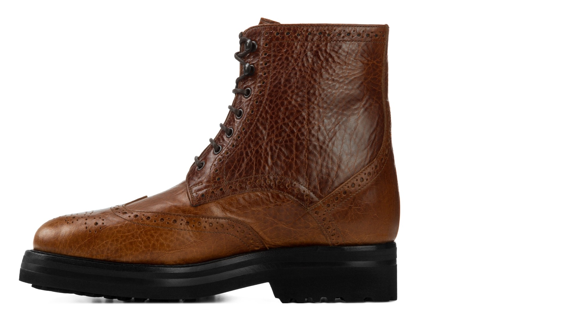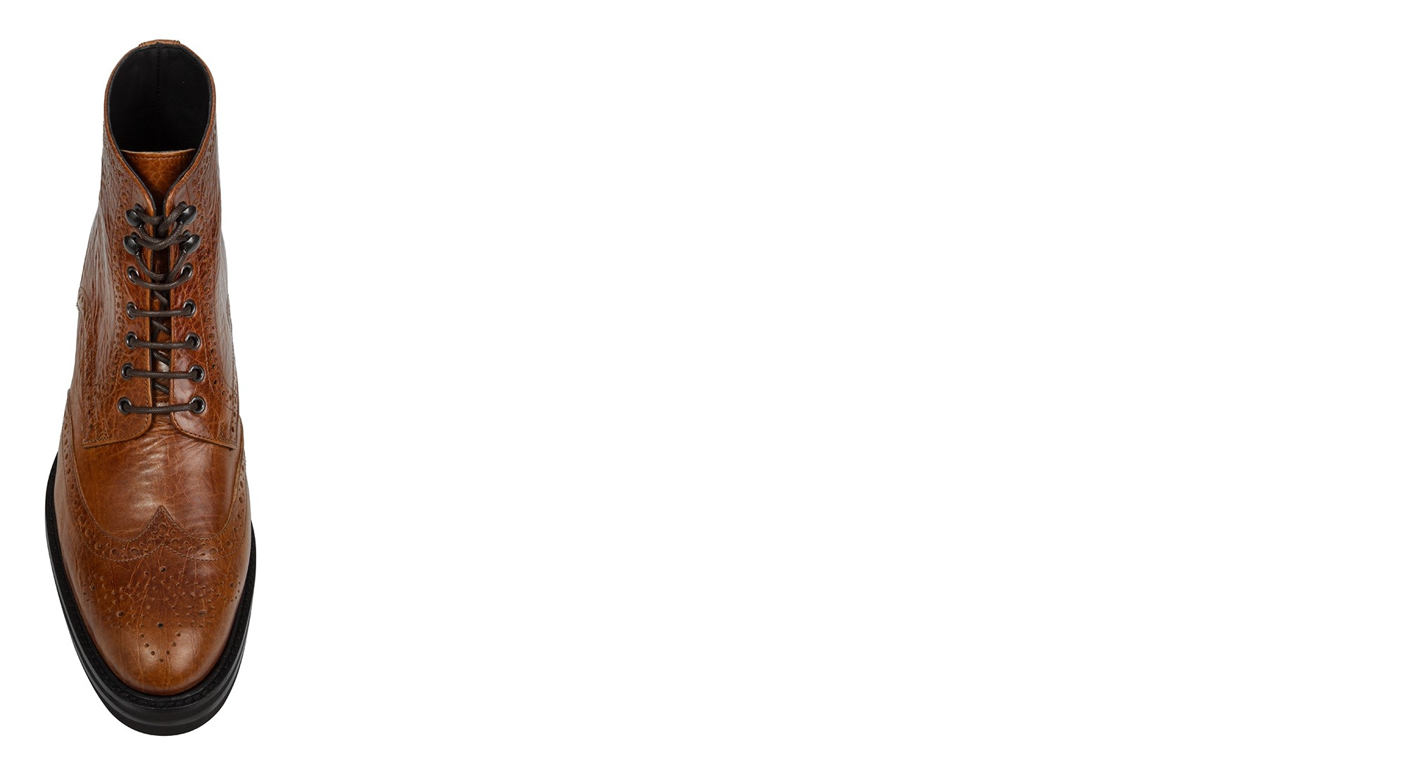 Il modello Pontedera unisce la robustezza dell’anfibio alla raffinatezza dei dettagli brogue. La nappa martellata toscana color cuoio trasmette artigianalità e autenticità.