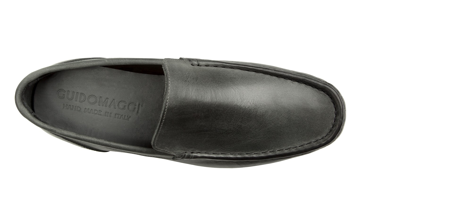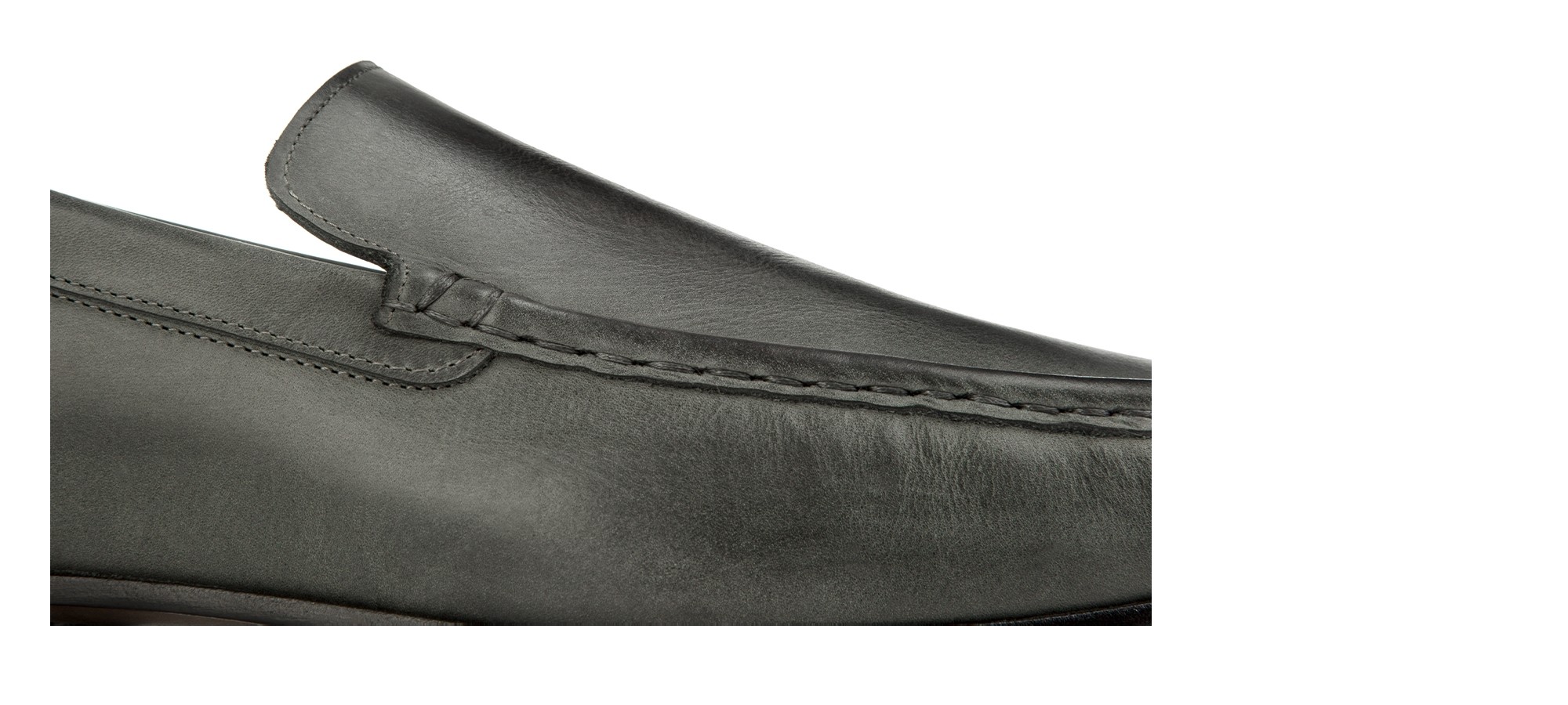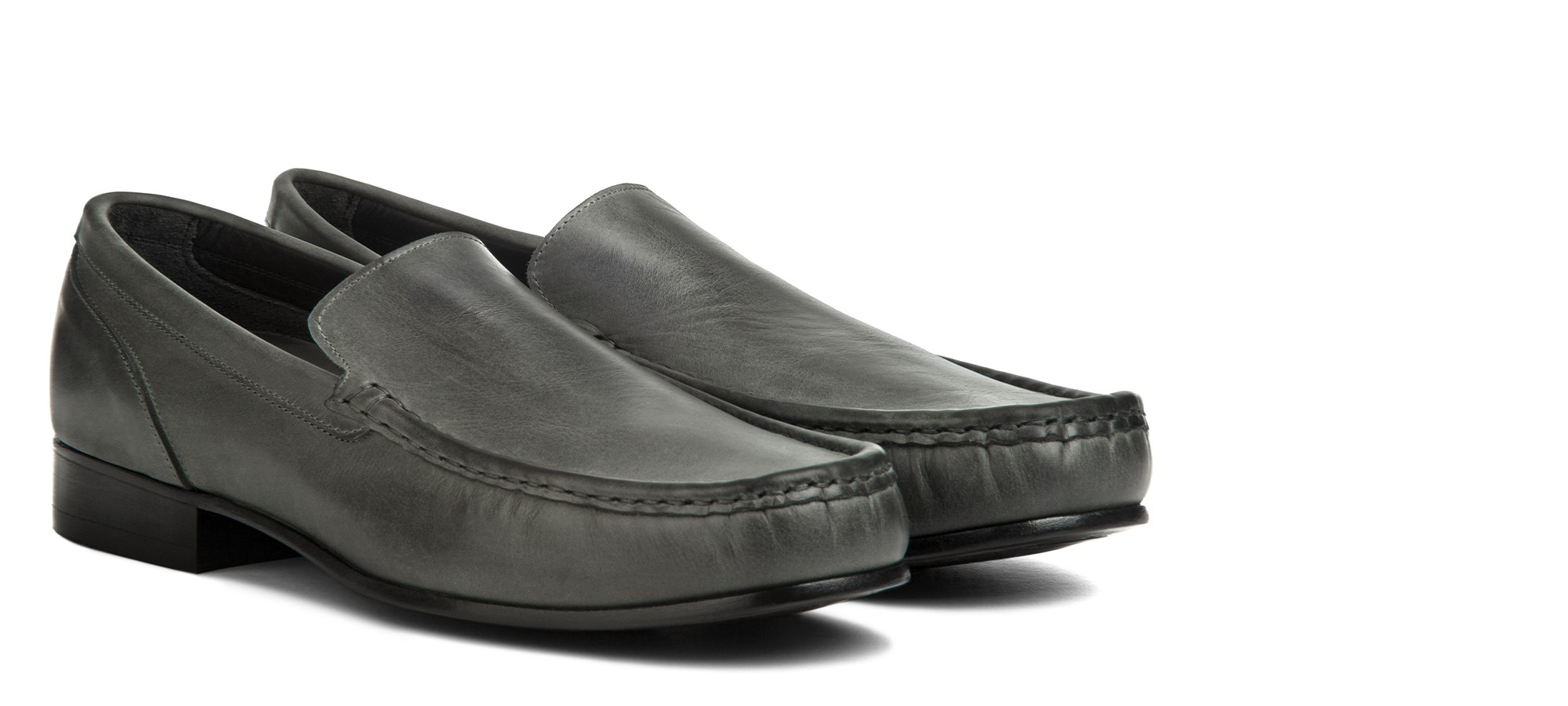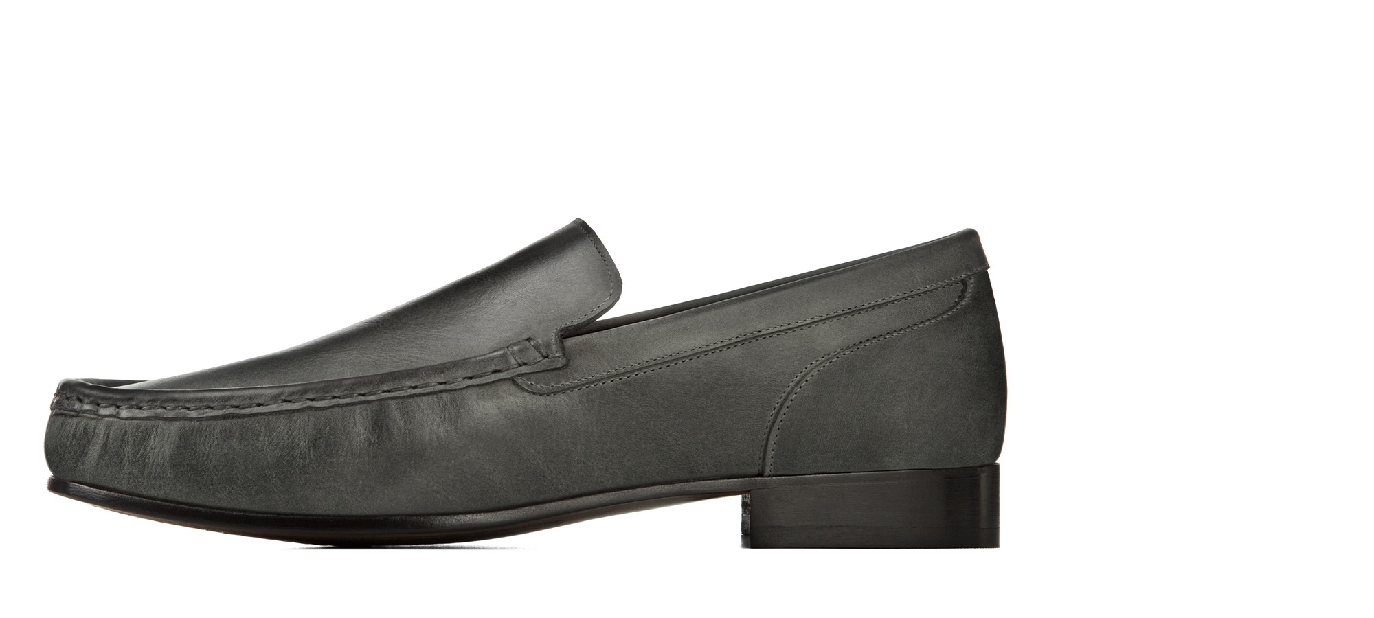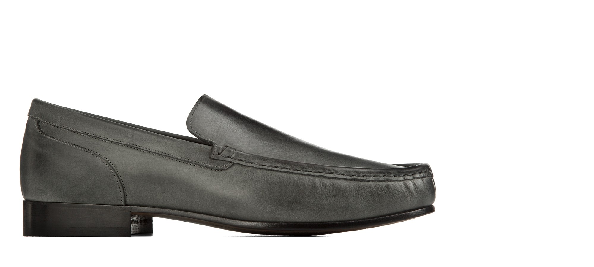 Mocassino rialzante senza morsetto, lavorato artigianalmente, in lussuosa pelle Cordovan dalla particolare colorazione grigio fumo: un pellame pregevole e rarissimo che si contraddistingue per le sue naturali venature.