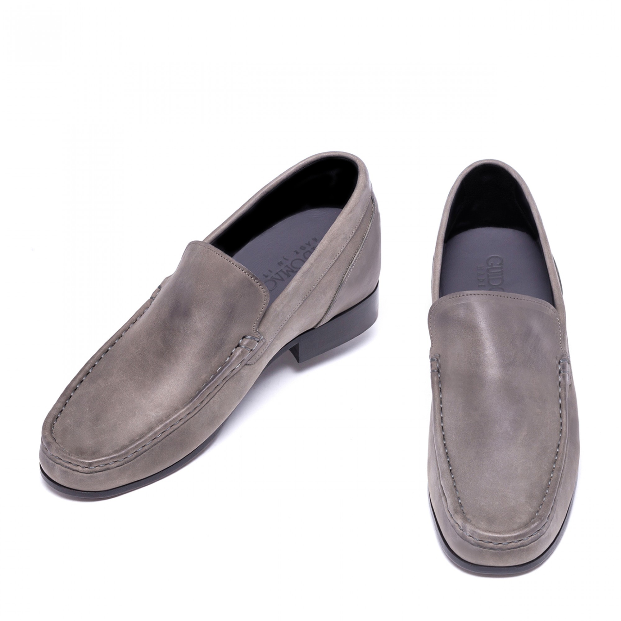 Mocassino rialzante senza morsetto, lavorato artigianalmente, in lussuosa pelle Cordovan dalla particolare colorazione grigio fumo: un pellame pregevole e rarissimo che si contraddistingue per le sue naturali venature.