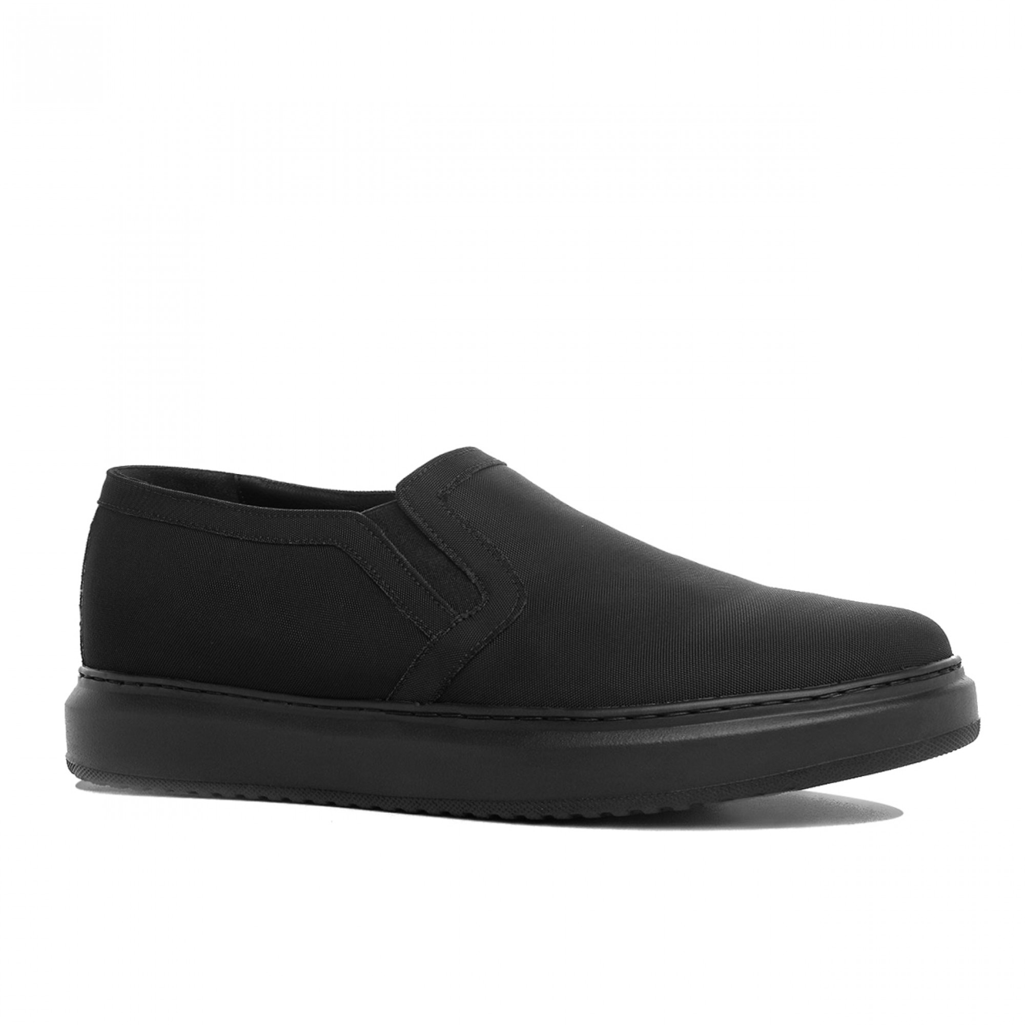 Slip-on rialzante con tomaia in tessuto tecnico nero e comoda suola in gomma tono su tono.