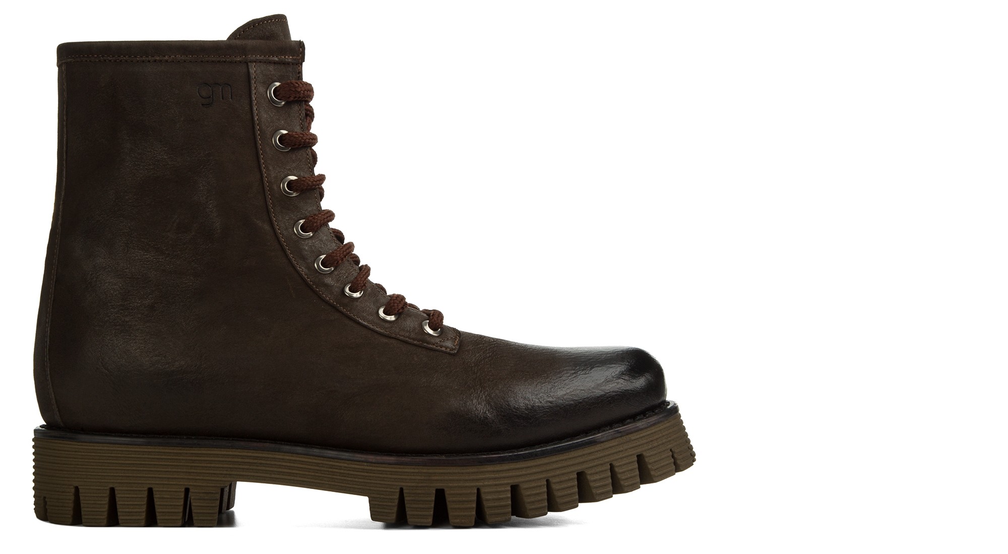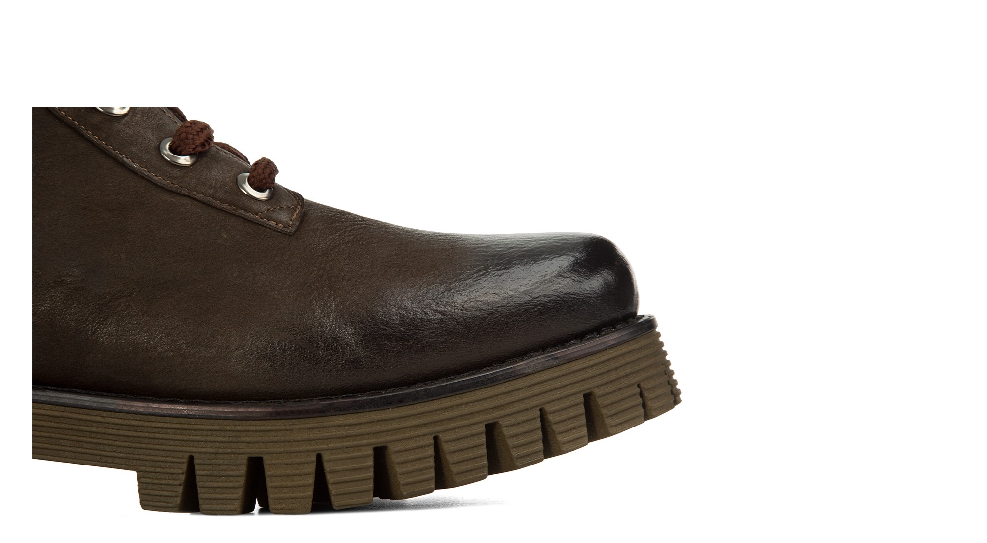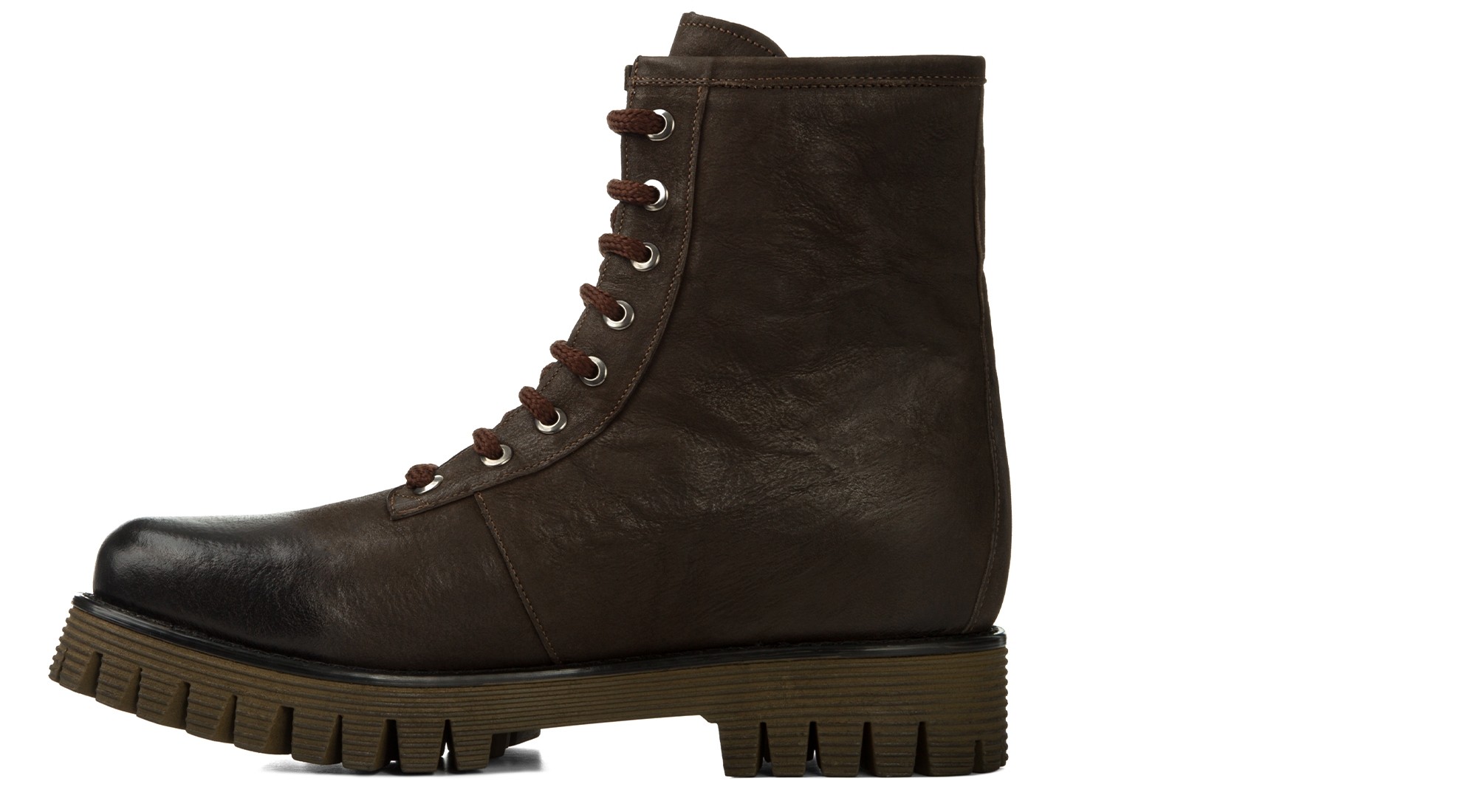 Anfibio rialzante lavorato artigianalmente con tomaia in pelle di vitello cerata dalla particolare texture brown con sfumature più scure sulla punta che ne esaltano il fascino vintage. La suola in gomma rigata color verde oliva assicura il massimo comfort, maggiore stabilità e resistenza.