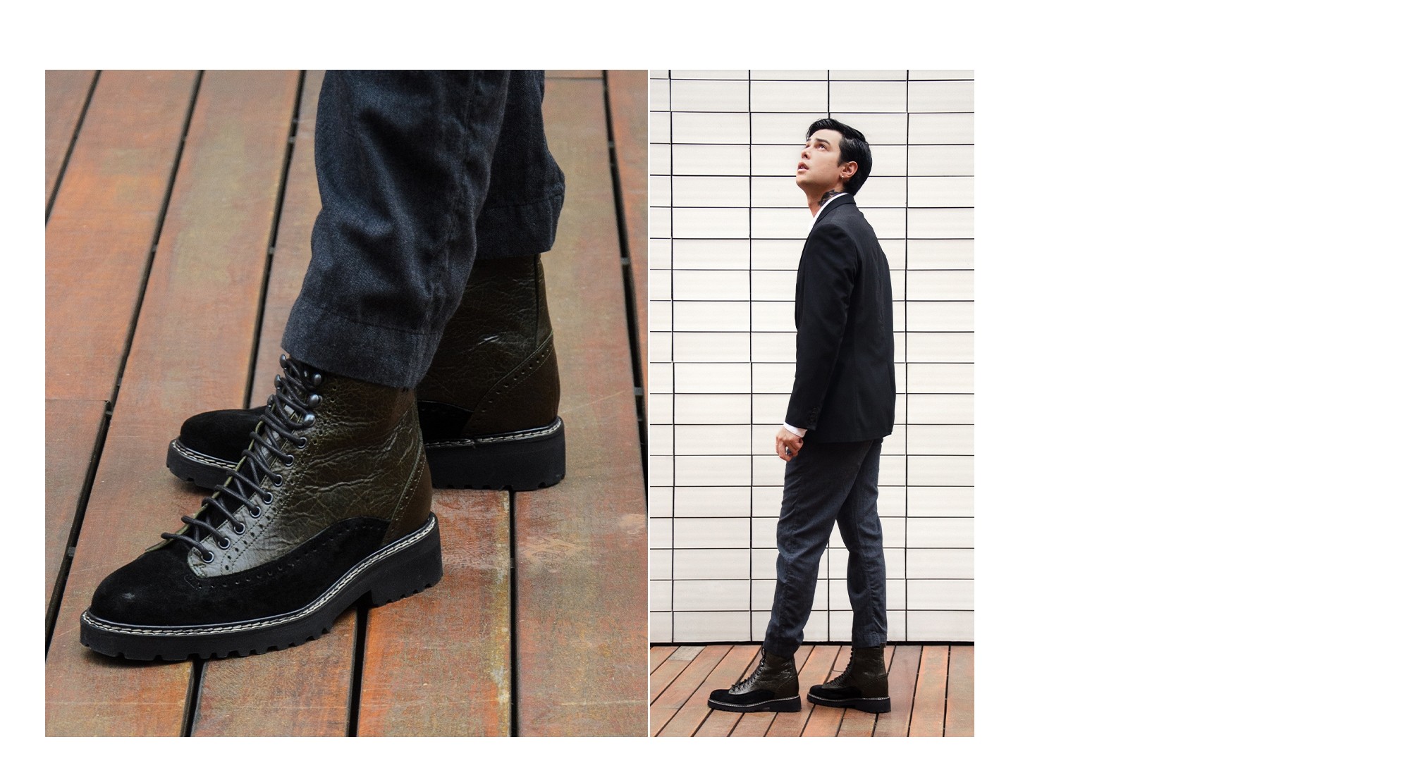 La tomaia è in nappa toscana verde, mentre sul puntale è in scamosciato nero. I lacci finiscono con dei comodi ganci che impreziosiscono il modello. Una suola importante, comoda, dona fino a 15 centimetri di altezza in più. Handmade in Italy.
