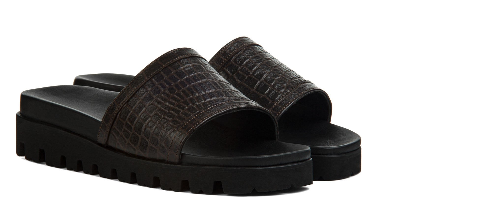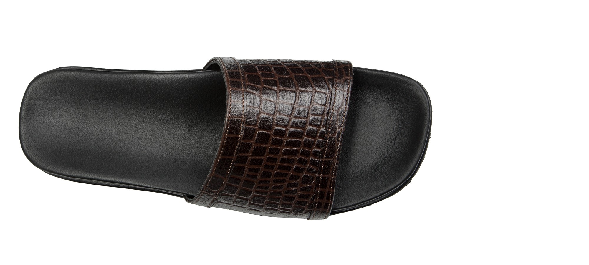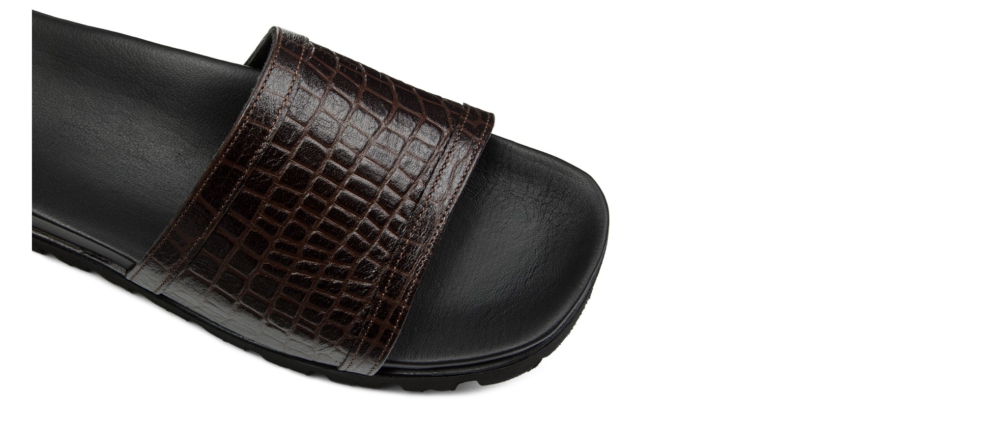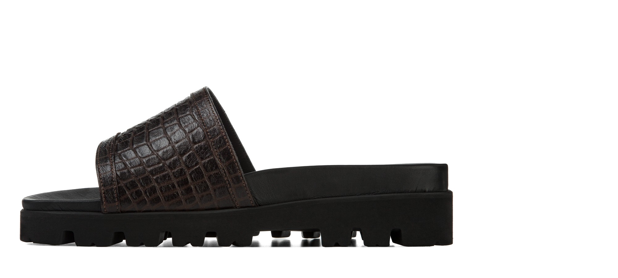 Anche a bordo piscina o in spiaggia, GuidoMaggi ti permette di non rinunciare all’eleganza e alla voglia di slanciare la silhouette grazie a questo sandalo rialzante stiloso e cool. Il fascione è in pelle di vitello con stampa cocco, delle suadenti sfumature marroni, a contrasto con la suola nera. Il plantare anatomico rende confortevole il rialzo fino a 5 centimetri, in totale confort e discrezione. Fatta a mano e su misura.